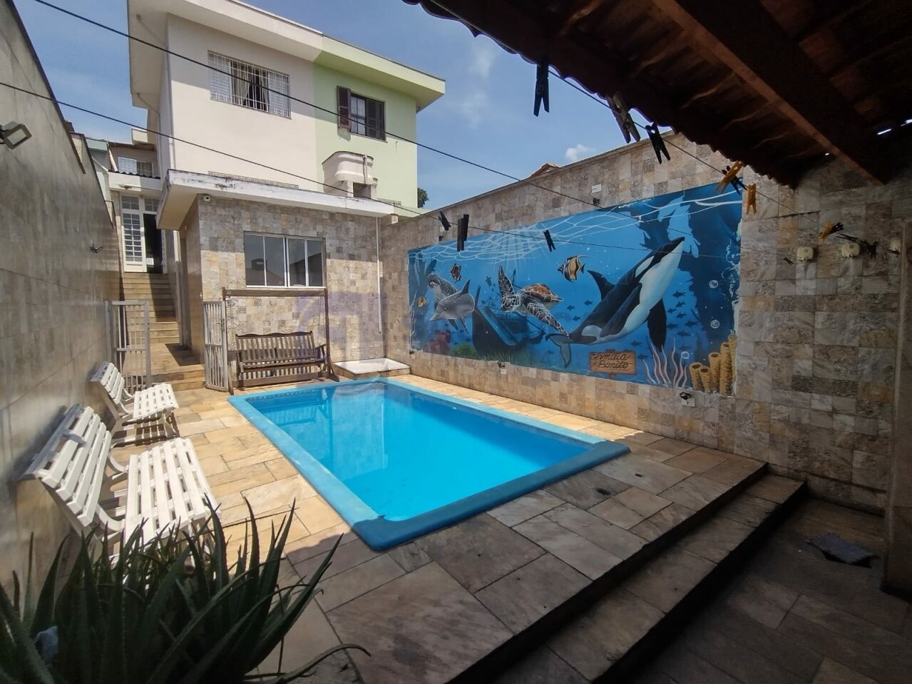 Privacidade e conforto com 3 dormitórios, 1 suíte, 2 dormitórios com closet, 1 banheiro social com hidromassagem e box independente, ampla sala de estar, sala de jantar integrada a cozinha com armários planejados, despensa, lavabo, área de serviço coberta, espaço fitness, sala de jogos/tv com churrasqueira, aconchegante espaço gourmet com churrasqueira, linda piscina, e 2 vagas de garagem com portão automático.